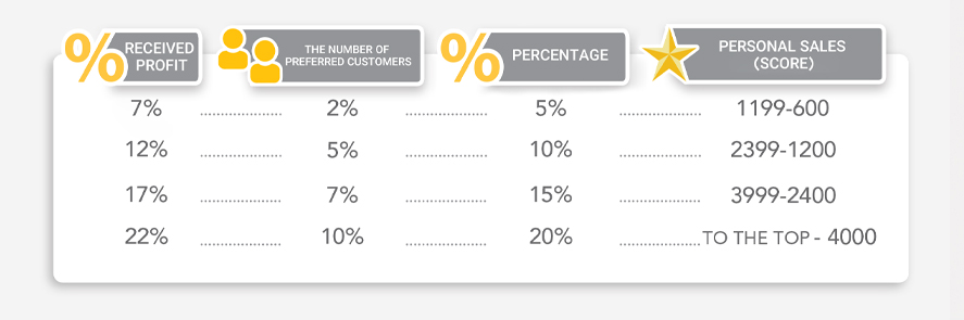 By attracting a customer in the company's success plan, each consultant can benefit solely from percentage increases and consequently higher income. To achieve a rank, especially the rank related to 25%, which is considered as a separated individual, one must fully accumulate 10,000 points.