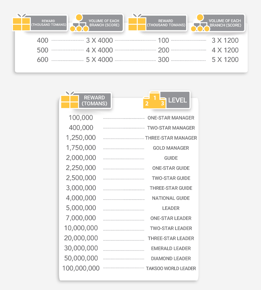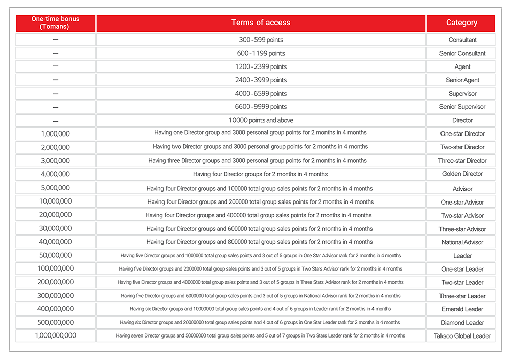 Note 1: To qualify for this bonus, any consultant with a separated group must have at least 3,000 points in their personal group (non-separated branches). To receive the full bonus, an individual must have 6,000 points in the sales volume of their personal groups (non-separated branches). If they have fewer than 6,000 points but more than 3,000 points, they will receive a proportionate amount based on the difference. For example, if a person has a separated bonus of 100,000 Tomans and has 4,500 points in their personal group, they will receive 75% of that amount (4,500 divided by 6,000 points), which is 75,000 Tomans.