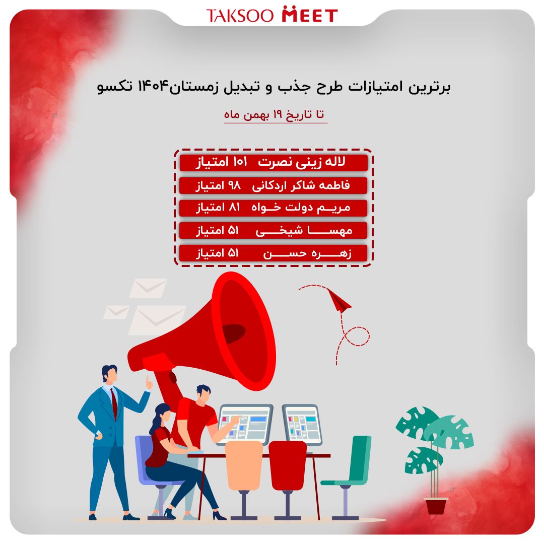 مشاورانی که طبق شرایط این طرح در آذر ماه ۱۴۰۴ مشمول دریافت بج سینه رتبه تاپ ران شدند، به شما همراهان همیشگی تکسو معرفی می شوند.